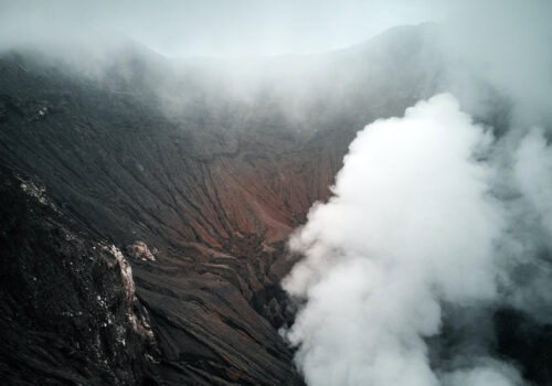 Discover a steaming volcanic crater amid misty mountain surroundings, where nature’s raw power and beauty collide in stunning fashion.